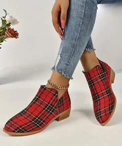 Ankle Boots Women’s Christmas Plaid Print Zipper Retro Red Plaid Chelsea Boots Outdoor Platform Shoes Classic Side Booties