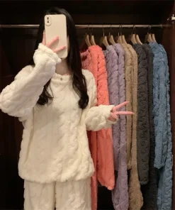 Thickened Warm Sleepwear for Winter Women Flannel Suit Student Pajamas Homewear Tops and Pants Striped Nightwear Loungewear